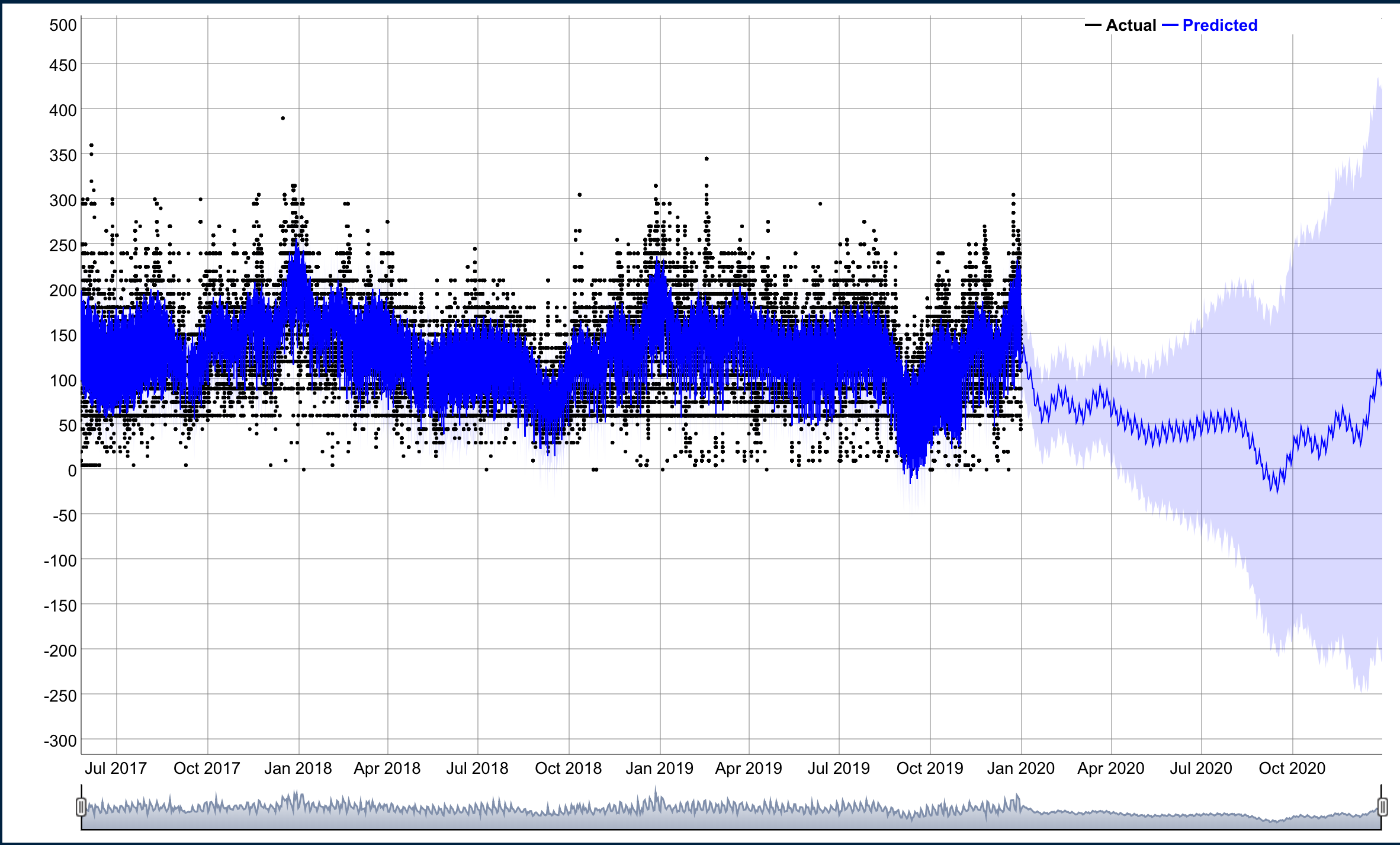 We can use dyplot.prophet() to create an interactive dyplot but I have included a static picture here so it loads faster on this site. We can see that on the Y axis overall that the overall wait time trend appears to be ~120 minutes. Prophet created a time series forecast as indicated by the blue line and as we expect the error increases as you predict more in the future.
